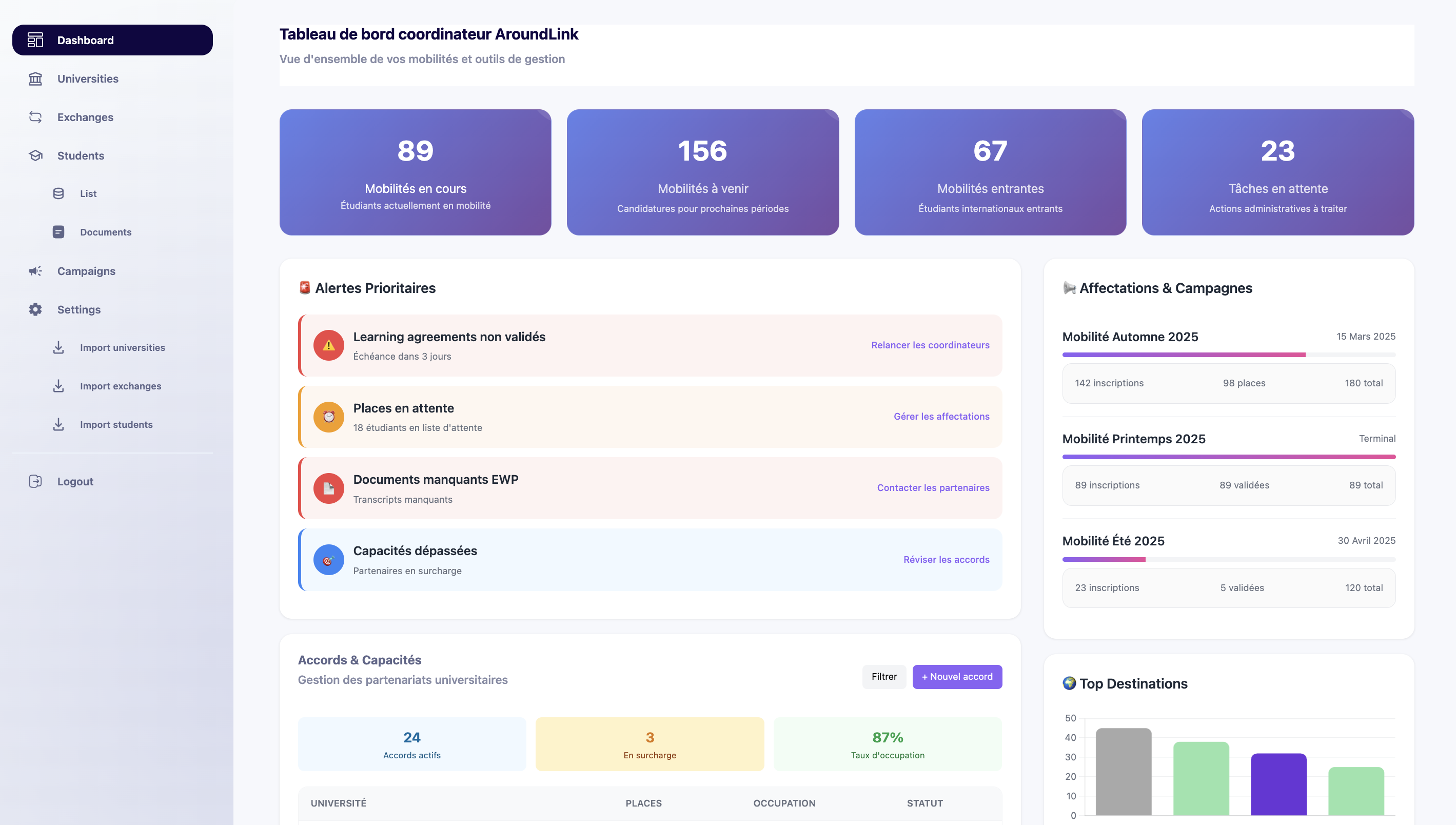 AroundLink centralizes all data, automates student flows, and simplifies the mobility process for institutions and students through a modern, intuitive SaaS platform.