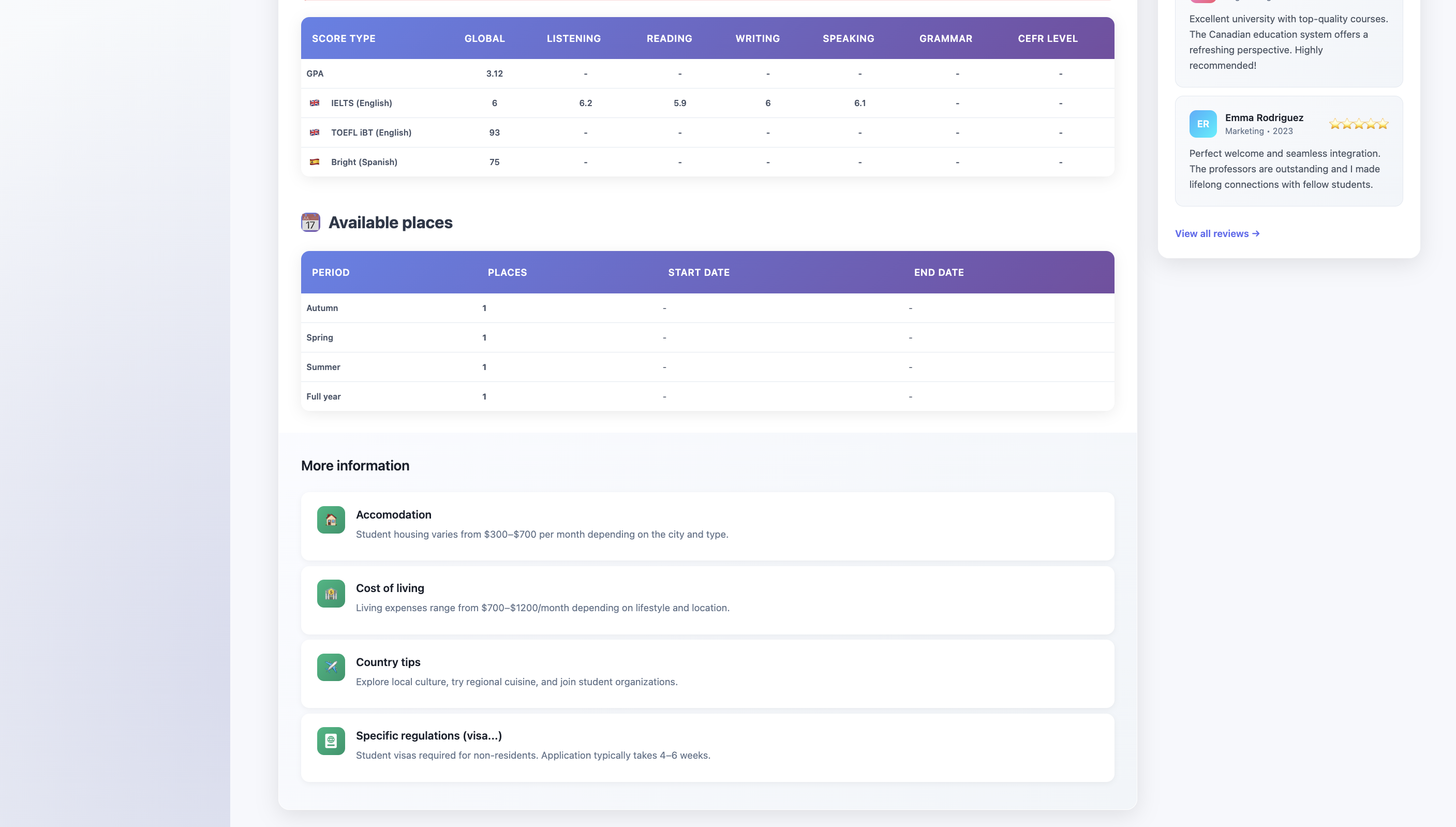 Easily compare partner universities based on your criteria: language, cost of living, academic quality, student feedback, etc.